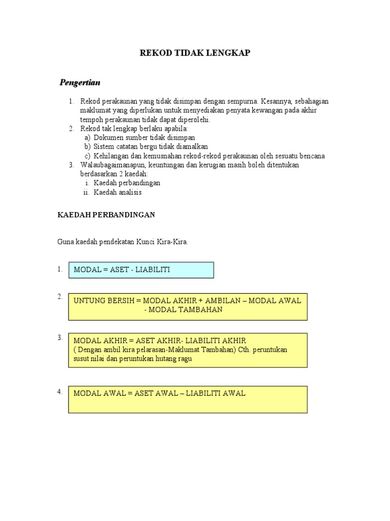 Feb 20 2021 View SLIDE MODUL 12-rekod tak lengkappptx from AKAUN 37563 at SMK Khir Johari. May 01 2021 Rekod Tak Lengkap Intro Kaedah Perbandingan. Modul Pembelajaran Kendiri Rekod Tak Lengkap Kaedah Perbandingan Soalan Percubaan SPM Prinsip Perakaunan 2012 - Negeri Kedah 5.